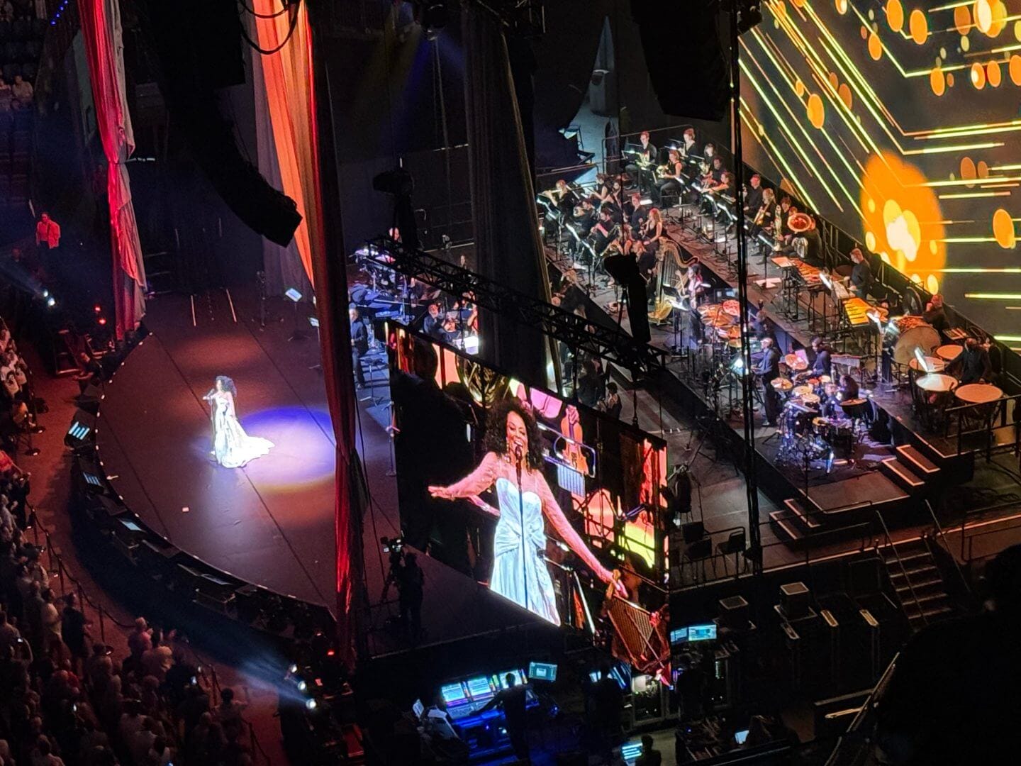 Ross made her grand entrance to the anthem “I’m Coming Out” amid a sweeping orchestral overture, glowing in a dazzling white gown that she later joked was “far too long” onstage . She then launched into a medley of 1960s Supremes classics – including “Baby Love,” “You Can’t Hurry Love,” and “Stop! In the Name of Love” – with vintage Motown footage playing on giant screens behind her . Throughout the night, the Royal Philharmonic’s lush arrangements added extra grandeur to Ross’s hits, seamlessly blending pop and soul with symphonic power.